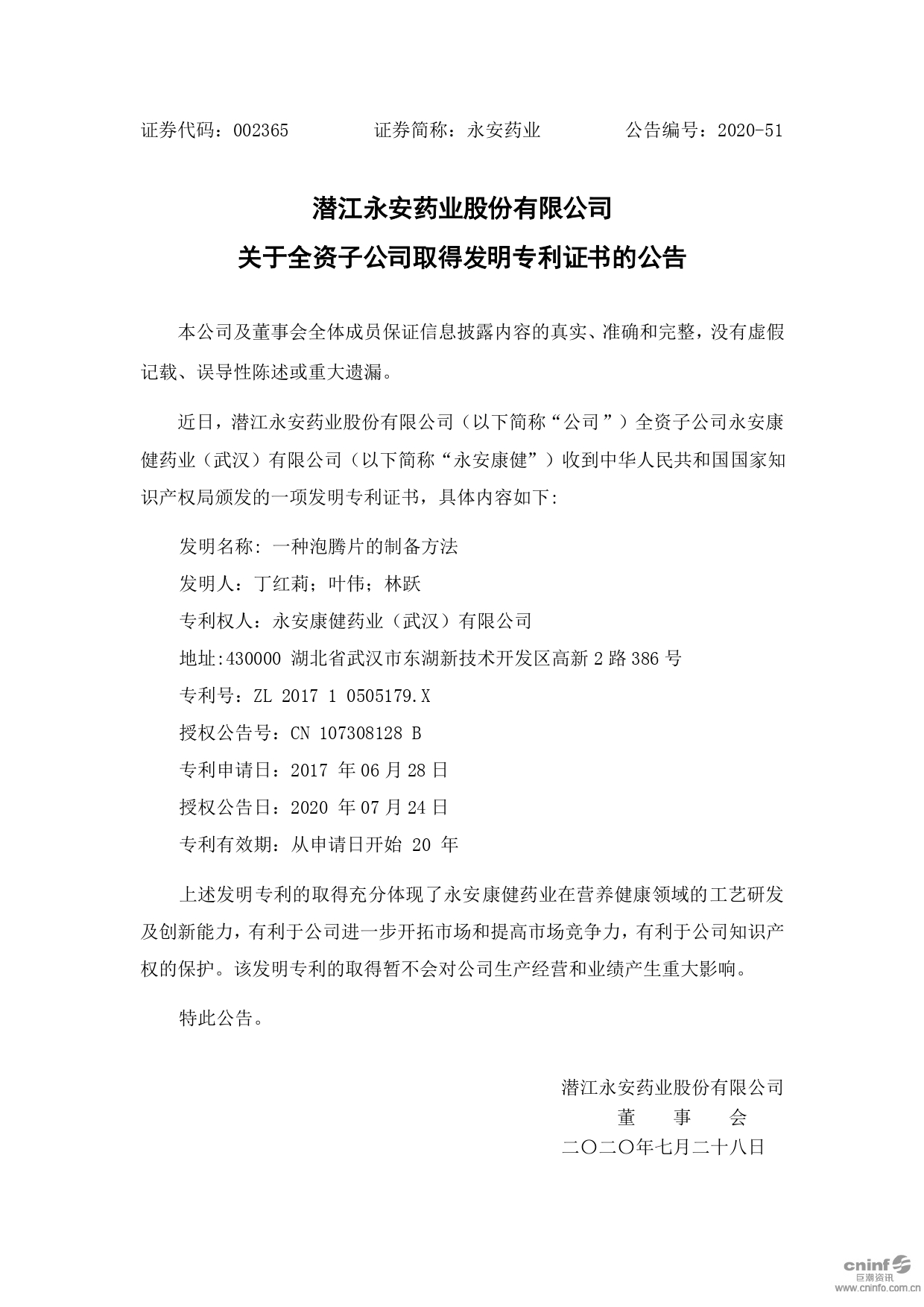 關(guān)于全資子公司取得發(fā)明專利證書的公告