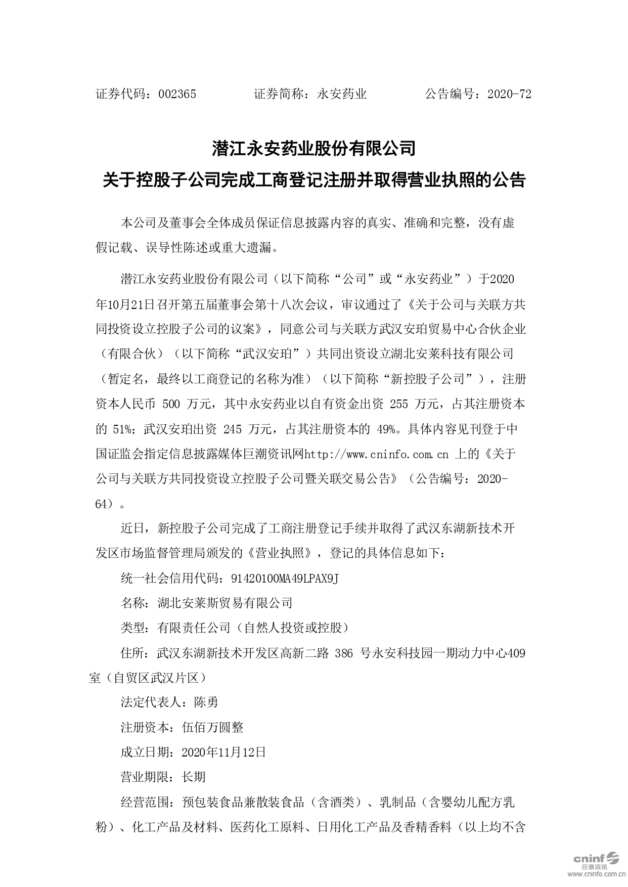 關(guān)于控股子公司完成工商登記注冊(cè)并取得營(yíng)業(yè)執(zhí)照的公告