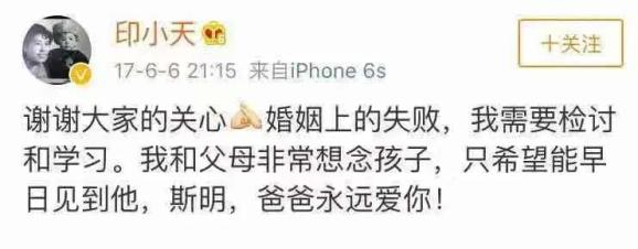 勝訴后,妻子便帶著孩子消失了,印小天連孩子的面都沒能見到,只能在微博上訴說著想念。