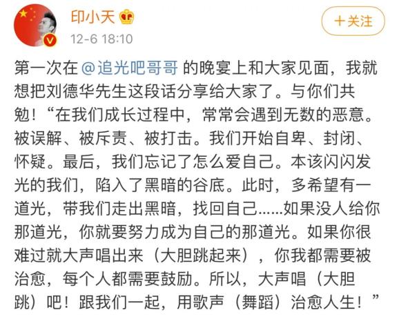 在這段長文中,他引用了劉德華的一段話:“在我們成長過程中,常常會遇到無數(shù)的惡意,被誤解、被斥責(zé)、被打擊。
