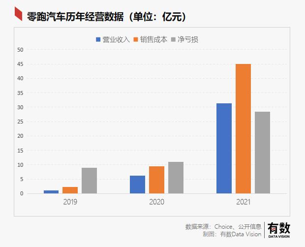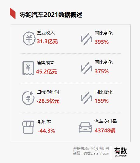 就招股書中的數(shù)據(jù)顯示, 2021年全年,零跑汽車合計交付43748輛電動汽車,同比增長超400%,堪稱造車新勢力中增速最快。毛利率從2019年的-95.7%增長到最新的-44.3%,活脫脫一幅造車新勢力的又一員猛將誕生的畫面感。