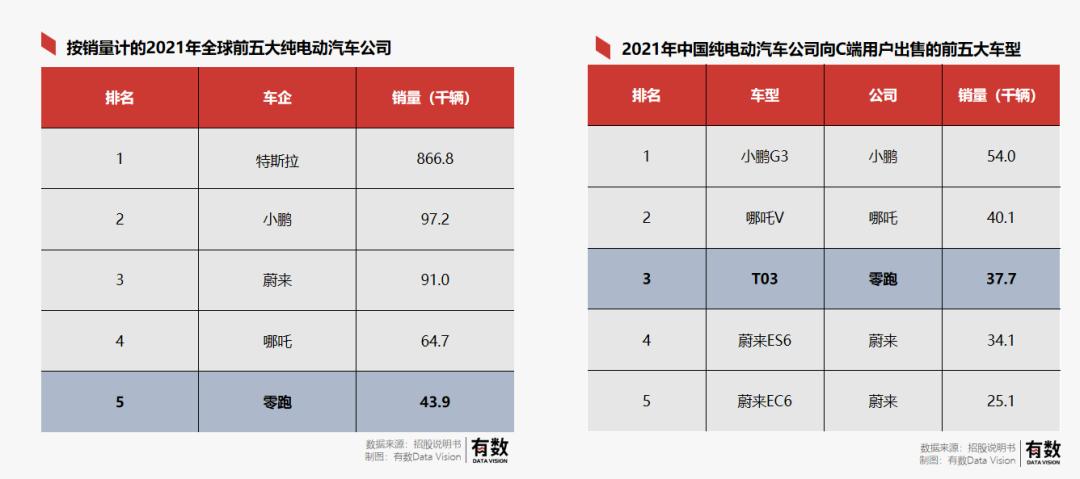 零跑的主力車型是微型車T03,截止2021年底總計交付約4.6萬輛,也就是類似五菱宏光mini和歐拉黑貓那種車型,定價在7萬附近??恐@款車的大賣,零跑汽車在數(shù)量上沖進了全球純電汽車公司的前五名,如果單論T03向C端用戶的銷售量,在中國甚至能排到第三名。