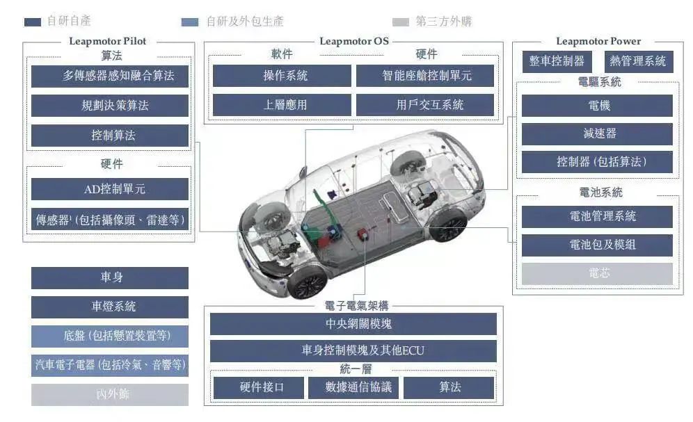 零跑汽車宣稱全域自研,不同于其他車企或?qū)W⒂谛酒⒒驅(qū)W⒂谥悄荞{駛,零跑上來就要做所有核心系統(tǒng)和電子部件的自主研發(fā)設(shè)計與生產(chǎn)制造。零跑除了電芯、底盤、汽車電子電器、內(nèi)外飾為自研及外包生產(chǎn)外,所有其他零部件包括車燈都自產(chǎn)自研。