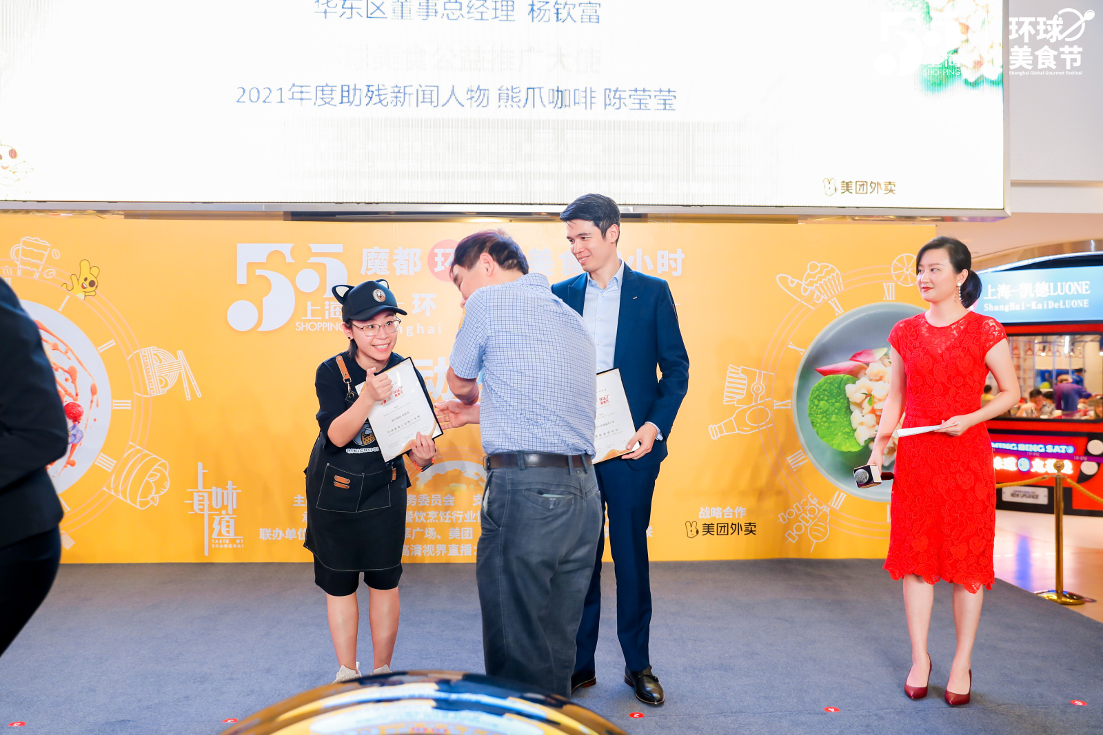 啟動儀式現(xiàn)場,第三屆環(huán)球美食節(jié)評選的十位環(huán)球美食推廣大使和一位公益大使也正式獲頒。十位環(huán)球美食推廣大使是來自外灘·林家一、樽宴、魯采、ALIMENTARI、宜家、膽道等餐廳的主廚,公益大使則是來自熊爪咖啡的殘障咖啡師陳瑩瑩。