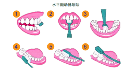 適合青少年的刷牙方法是“水平顫動拂刷法”,將刷毛末 端指向牙根方向,與牙面呈 45 度角,放在牙與牙齦交界處, 短距離水平顫動 5 次, 然后轉動牙刷柄, 沿牙齒長出的方向 拂刷牙面,每個牙面都刷到。