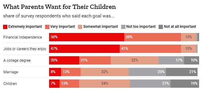 在皮尤研究中心最近發(fā)布的一項(xiàng)關(guān)于父母態(tài)度的新研究中,幾乎一半的受訪父母說(shuō),對(duì)他們來(lái)說(shuō)孩子是否結(jié)婚或生子不太重要或根本不重要。甚至,在他們眼中,獲得一個(gè)大學(xué)學(xué)位比組建一個(gè)家庭來(lái)得更重要。