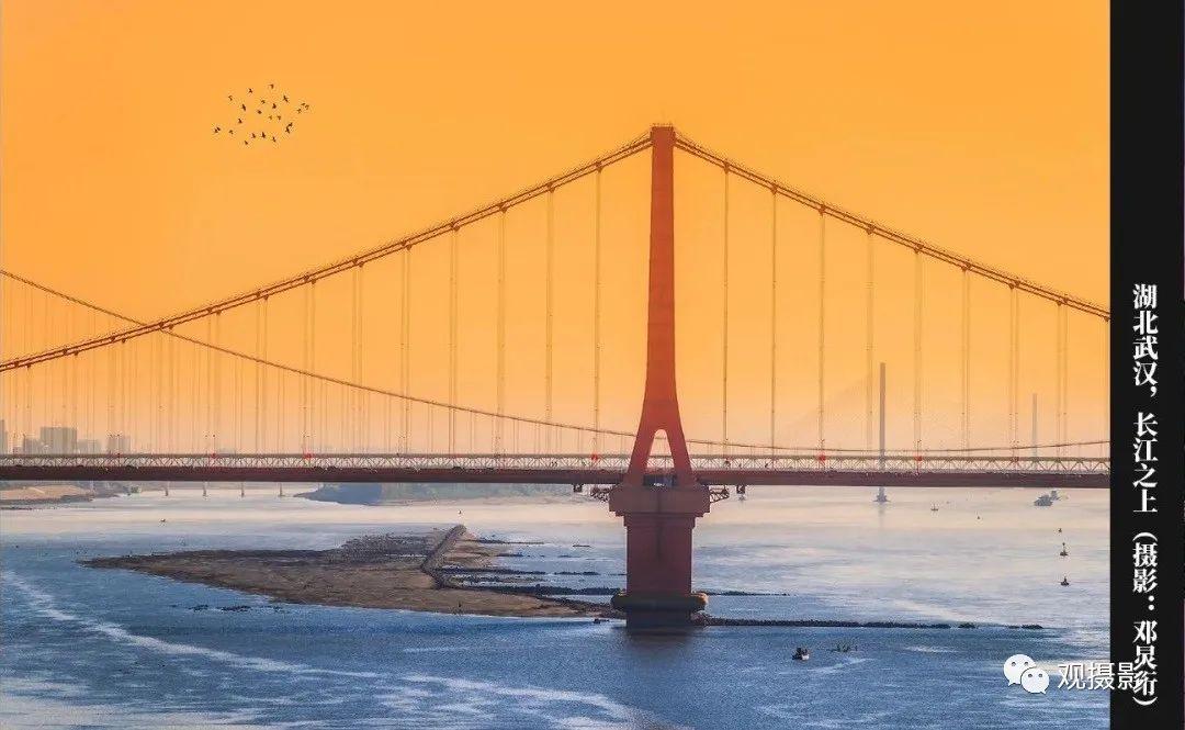 長江大橋,滔滔江水,落日余暉,泛舟游客,飛鳥歸巢,自然的饋贈與現(xiàn)代文化的碰撞構(gòu)現(xiàn)出一副這樣的影像——“湖北武漢,長江之上”。這作品由攝影師鄧炅珩拍攝,目前已被人民日報文創(chuàng)收錄。