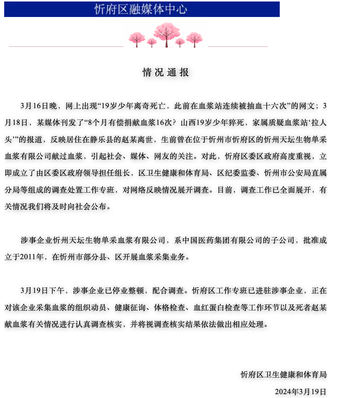 據(jù)媒體報(bào)道稱(chēng),近日,“山西一名19歲男孩趙某猝死,此前曾8個(gè)月在血漿站連續(xù)抽血16次”的內(nèi)容引發(fā)廣大網(wǎng)友關(guān)注。3月19日,忻州市忻府區(qū)衛(wèi)生健康和體育局針對(duì)此事發(fā)布相關(guān)情況通報(bào)。通報(bào)指出,3月16日晚,網(wǎng)上出現(xiàn)“19歲少年離奇死亡,此前在血漿站連續(xù)被抽血十六次”的網(wǎng)文;3月18日,某媒體刊發(fā)了“8個(gè)月有償捐獻(xiàn)血漿16次?山西19歲少年猝死,家屬質(zhì)疑血漿站‘拉人頭’”的報(bào)道,反映居住在靜樂(lè)縣的趙某離世,生前曾在位于忻州市忻府區(qū)的忻州天壇生物單采血漿有限公司獻(xiàn)過(guò)血漿,引起社會(huì)、媒體、網(wǎng)友的關(guān)注。