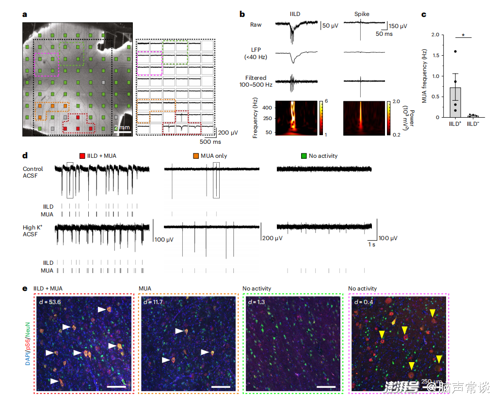作者使用多電極陣列(MEAs)對(duì)來自手術(shù)FCDII皮質(zhì)回的四個(gè)相鄰的急性皮質(zhì)切片進(jìn)行了細(xì)胞外記錄。皮層切片顯示兩種主要類型的活動(dòng):(1)具有單個(gè)尖峰和尖峰爆發(fā)的多單元活動(dòng)(MUA)和(2)發(fā)作間期樣放電(IILDs)。檢測(cè)到IILDs的電極MUA更高,表明IILD產(chǎn)生區(qū)與更高的神經(jīng)元興奮性相關(guān)。在大多數(shù)電極上均未檢測(cè)到自發(fā)活動(dòng),包括灰質(zhì)和白質(zhì)區(qū)域。因此,MEA記錄劃分了一個(gè)以活動(dòng)梯度為特征的灰質(zhì)區(qū)域。對(duì)磷酸化的s6(pS6)蛋白(mTOR活性的標(biāo)準(zhǔn)讀數(shù))和NeuN(神經(jīng)元標(biāo)記物)進(jìn)行免疫熒光染色,觀察到神經(jīng)元活性與巨細(xì)胞pS6+ DNs的存在之間的相關(guān)性。這些數(shù)據(jù)表明,巨細(xì)胞DNs(攜帶突變的神經(jīng)元)可能有助于癲癇樣活動(dòng)。