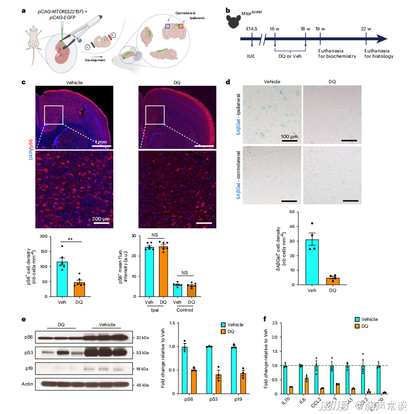 為了探索利用衰老藥物靶向衰老細(xì)胞的潛力:一種新型分子,可以選擇性地消除衰老細(xì)胞,以減輕癲癇表型,作者利用基于子宮內(nèi)電穿孔(IUE)的小鼠模型。該FCDII小鼠模型具有臨床相關(guān)性,因?yàn)樗爬岁P(guān)鍵的FCDII組織病理學(xué)特征,包括異常神經(jīng)元遷移和mTOR過度活躍的pS6+巨細(xì)胞神經(jīng)元,并表現(xiàn)出從6周齡到至少42周齡的復(fù)發(fā)性自發(fā)電臨床發(fā)作。在胚胎日(E) 14.5小鼠胚胎中對(duì)mTORS2215F結(jié)構(gòu)進(jìn)行電穿孔,靶向產(chǎn)生2/3皮質(zhì)層錐體神經(jīng)元的徑向膠質(zhì)細(xì)胞,以模擬體內(nèi)體細(xì)胞突變。在10周齡小鼠中觀察到含有mTOR過度活躍(pS6+)的電穿孔皮質(zhì)區(qū)的SAβGal反應(yīng)性,但在對(duì)側(cè)非電穿孔皮質(zhì)區(qū)沒有。因此,作者使用mTOR S2215F小鼠模型來測(cè)試抗衰老藥物對(duì)減少衰老細(xì)胞并最終控制癲癇發(fā)作的作用。DQ處理顯著減少了pS6+神經(jīng)元的數(shù)量,DQ并沒有降低mTOR活性。