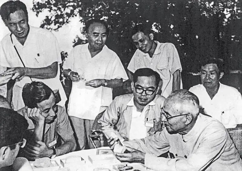 1964 年,北京國(guó)際科學(xué)討論會(huì)期間,李四光(右2)向各國(guó)地質(zhì)學(xué)家、古生物學(xué)家介紹多年收集的各種標(biāo)本圖/中國(guó)地質(zhì)科學(xué)院