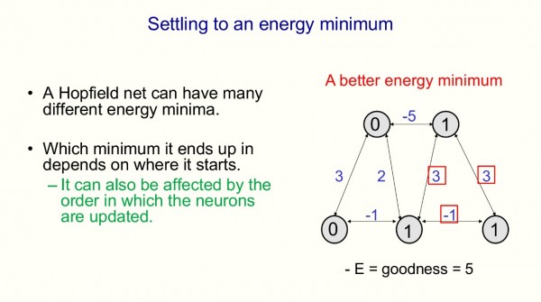 右邊的構型實際上是能量最小值,其能量為-4。如果選擇其中任何一個神經(jīng)元,在得到總的正輸入情況下,開啟的神經(jīng)元會傾向于保持開啟;在得到總的負輸入情況下,關閉的神經(jīng)元會傾向于保持關閉。一個霍普菲爾德網(wǎng)絡可以有許多能量最小值,最終穩(wěn)定在哪個狀態(tài)取決于起始狀態(tài),也取決于做出隨機決定的順序,也就是更新哪個神經(jīng)元的順序?,F(xiàn)在這個構型是一個更好的能量最小值,打開右邊三角形的神經(jīng)元,優(yōu)度是 3 + 3 - 1 = 5,所以能量是 -5,這是一個更好的最小值。
