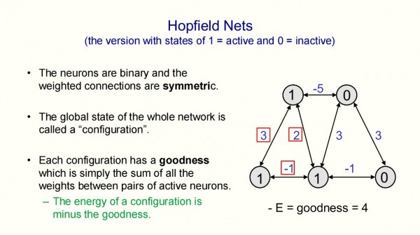 霍普菲爾德網(wǎng)絡使用二進制神經(jīng)元,這些神經(jīng)元的狀態(tài)為1或0。右邊可以看到一個霍普菲爾德網(wǎng)絡,這些神經(jīng)元之間有對稱的加權連接。整個網(wǎng)絡的全局狀態(tài)被稱為一個“構型”(configuration)。每個構型都有一個“優(yōu)度”(goodness),構型的優(yōu)度就是所有“同時開啟”的神經(jīng)元對之間權重的總和。把紅色框中的權重加起來是 4,這就是該網(wǎng)絡構型的優(yōu)度。而“能量”(energy)就是優(yōu)度的負數(shù)。這些網(wǎng)絡會穩(wěn)定到能量的最小值。圖片來源:Geoffrey Hinton – Nobel Prize lecture. NobelPrize.org. Nobel Prize Outreach AB 2024. Tue. 17 Dec 2024. https://www.nobelprize.org/prizes/physics/2024/hinton/lecture/