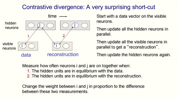 如果對玻爾茲曼機進行限制,就可以得到更快的學習算法。如果隱藏神經(jīng)元之間沒有連接,那么“清醒”階段就變得非常簡單。將輸入固定在可見神經(jīng)元上來表示圖像,然后并行地更新所有隱藏神經(jīng)元,這樣就可以達到熱平衡狀態(tài)。這樣你就已經(jīng)達到熱平衡了。只需要用很短的路徑更新一次,就可以很快達到熱平衡。這對隱藏神經(jīng)元來說很好,但在“睡眠”階段仍然有問題。將網(wǎng)絡置于某種隨機狀態(tài),不斷更新隱藏神經(jīng)元和可見神經(jīng)元,持續(xù)很長時間才能達到熱平衡。目前存在一個快捷方法:將數(shù)據(jù)放在可見單元,然后并行更新所有隱藏神經(jīng)元,之后達到熱平衡狀態(tài)?,F(xiàn)在你更新所有的可見單元,稱之為“重構”(reconstruction)。當網(wǎng)絡展示重構并且已經(jīng)與重構達到平衡時,測量同時開啟的頻率,這兩者之間的差異就是學習算法,之后只需要根據(jù)差異來按比例改變權重。這種做法的實際效果相當好,速度很快,快到足以使玻爾茲曼機變得更加實用。