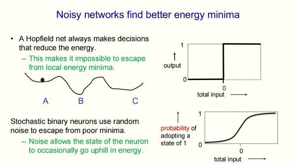 搜索問題:通過使神經(jīng)元具有“噪聲”來解決。如果有像標準霍普菲爾德網(wǎng)絡那樣的確定性神經(jīng)元,如果系統(tǒng)穩(wěn)定到一個能量最小值,比如 A 點——那里的球代表整個系統(tǒng)的狀態(tài),也就是整個系統(tǒng)的構型—無法從 A 點到達 B 點,因為神經(jīng)元的決策規(guī)則只允許能量下降。右邊的圖表是決策規(guī)則:如果輸入為正,則開啟;如果輸入為負,則關閉。希望能夠從A點到達B點,但這意味著必須在能量上“爬坡”。解決這個問題的方法是使用帶有噪聲的神經(jīng)元,也就是隨機二進制神經(jīng)元(stochastic binary neurons)。仍然只有二進制狀態(tài),狀態(tài)要么是 1,要么是 0。