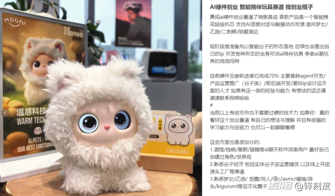 “尋找創(chuàng)業(yè)搭子:勇闖AI硬件創(chuàng)業(yè)賽道了,首款產(chǎn)品是一個(gè)智能棉花娃娃機(jī)芯,支持AI語音對話與觸摸動(dòng)作反饋,面向夢女、乙游、二次元、明星周邊。”