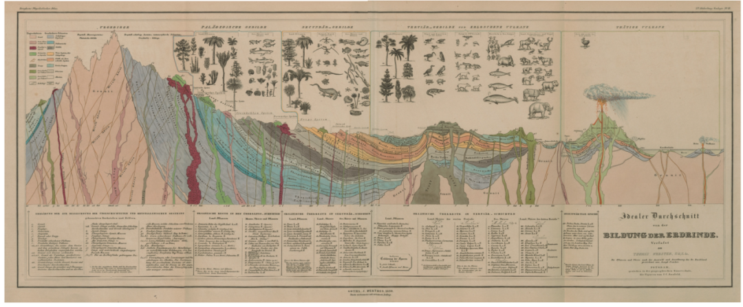 《宇宙》所附圖冊中的地殼橫截面圖,洪堡早在1807年就談到,非洲大陸與南美洲大陸可能曾經相連在一起。他也曾大膽地推測,大陸漂移的動力可能源于某種“地表以下的力量”