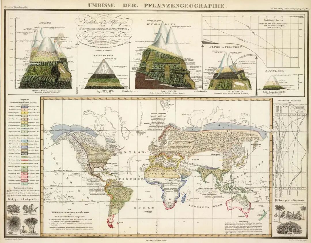 他用宏大的視野,將氣候帶、植被帶、地球磁場、巖石圈等自然要素編織成一張全球網絡圖。在他的筆下,每一種自然現(xiàn)象都各得其所,同時又彼此關聯(lián)、相互影響,最終匯聚成一幅恢宏的自然畫卷。
