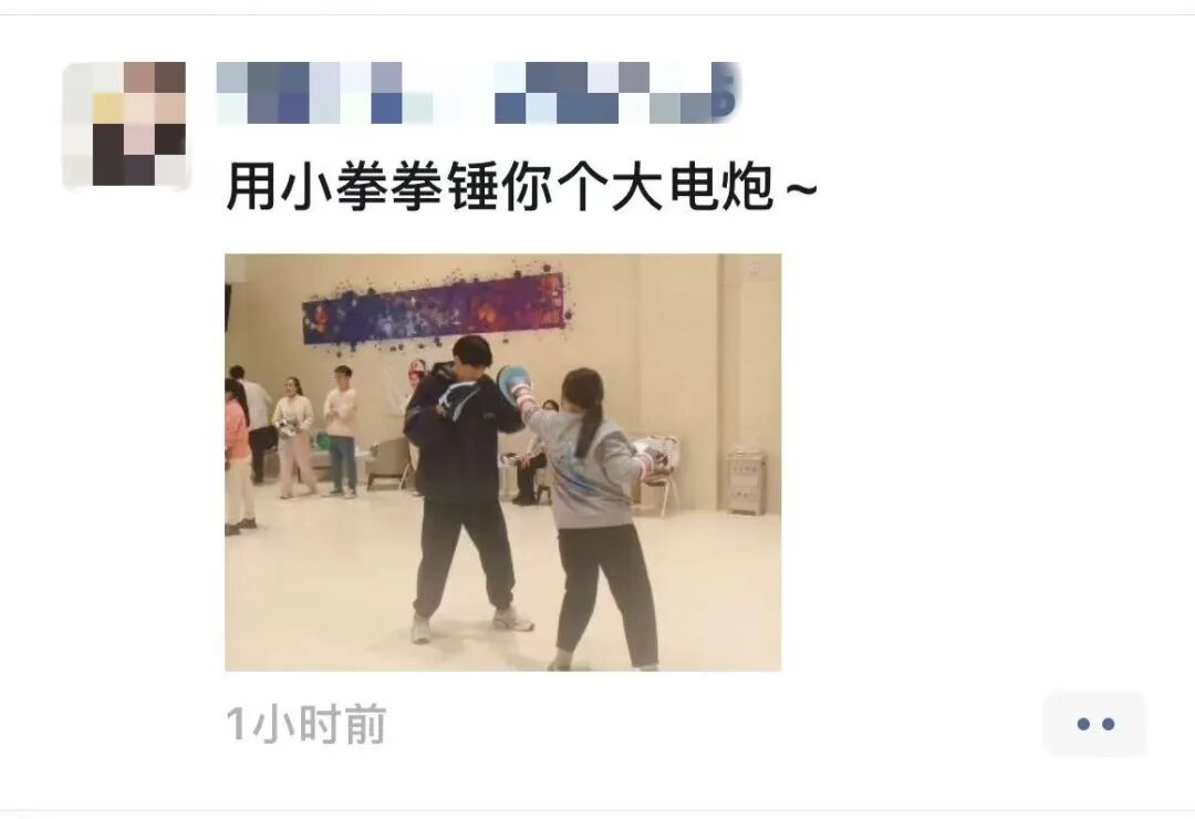 還有人無(wú)形中撒了一波狗糧,一張搏擊課上的對(duì)打照片:“用小拳拳錘你個(gè)大電炮!”