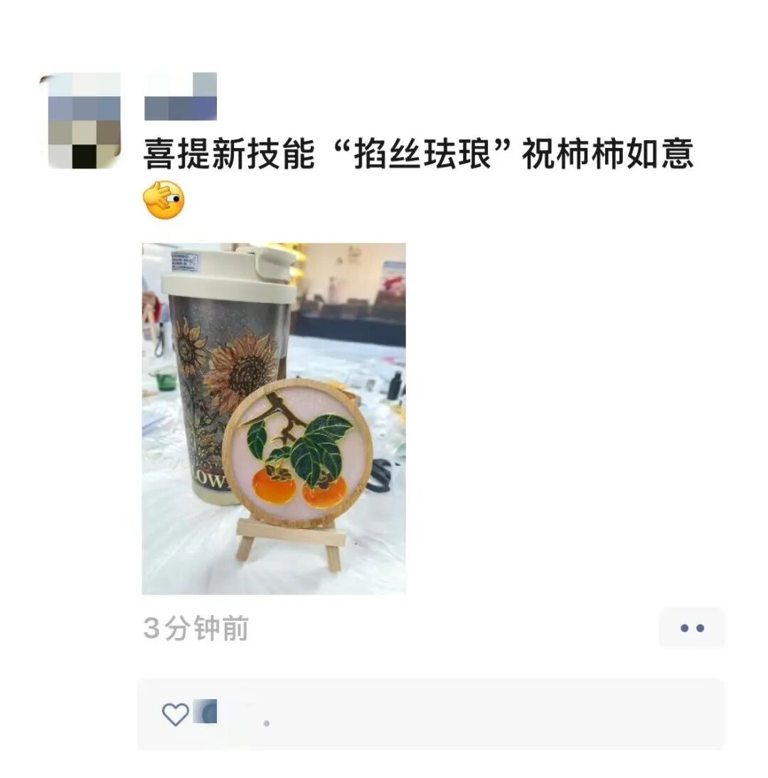 有人曬圖分享自己的琺瑯作品說(shuō):“喜提新技能‘掐絲琺瑯’祝柿柿如意?!?/p>