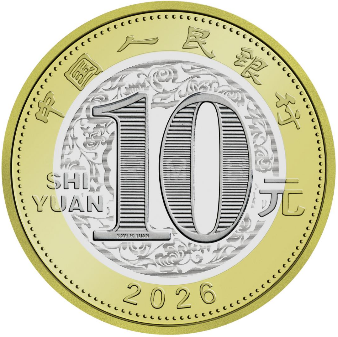 雙色銅合金紀(jì)念幣正面圖案為“中國人民銀行”“10元”字樣,漢語拼音字母“SHIYUAN”及年號(hào)“2026”,底紋襯以團(tuán)花圖案。背面圖案為中國傳統(tǒng)剪紙藝術(shù)與裝飾年畫元素相結(jié)合的馬形象,襯以花燈和萱草圖案,幣面左側(cè)刊“丙午”字樣。