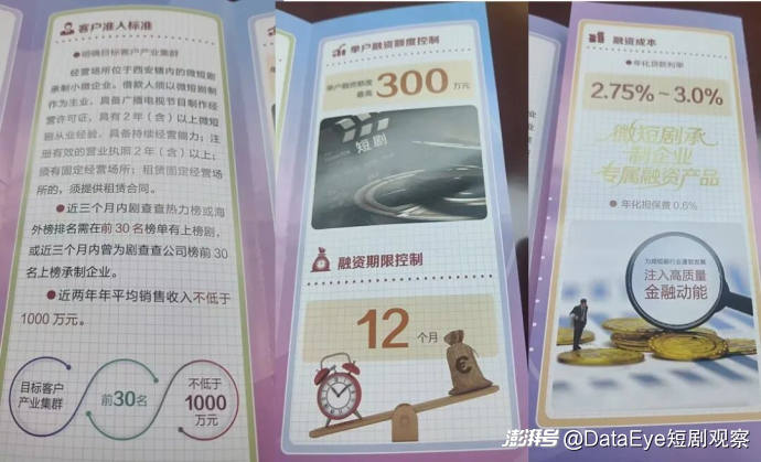 根據(jù)陜西省銀行業(yè)協(xié)會(huì)發(fā)布的信息,該貸款產(chǎn)品面向注冊(cè)地位于西安轄區(qū)、經(jīng)營(yíng)穩(wěn)定、近兩年年均銷售收入達(dá)1000萬(wàn)元(含)以上,近三個(gè)月內(nèi)在劇查查平臺(tái)熱力榜、海外榜或公司榜前30名的微短劇承制企業(yè)。