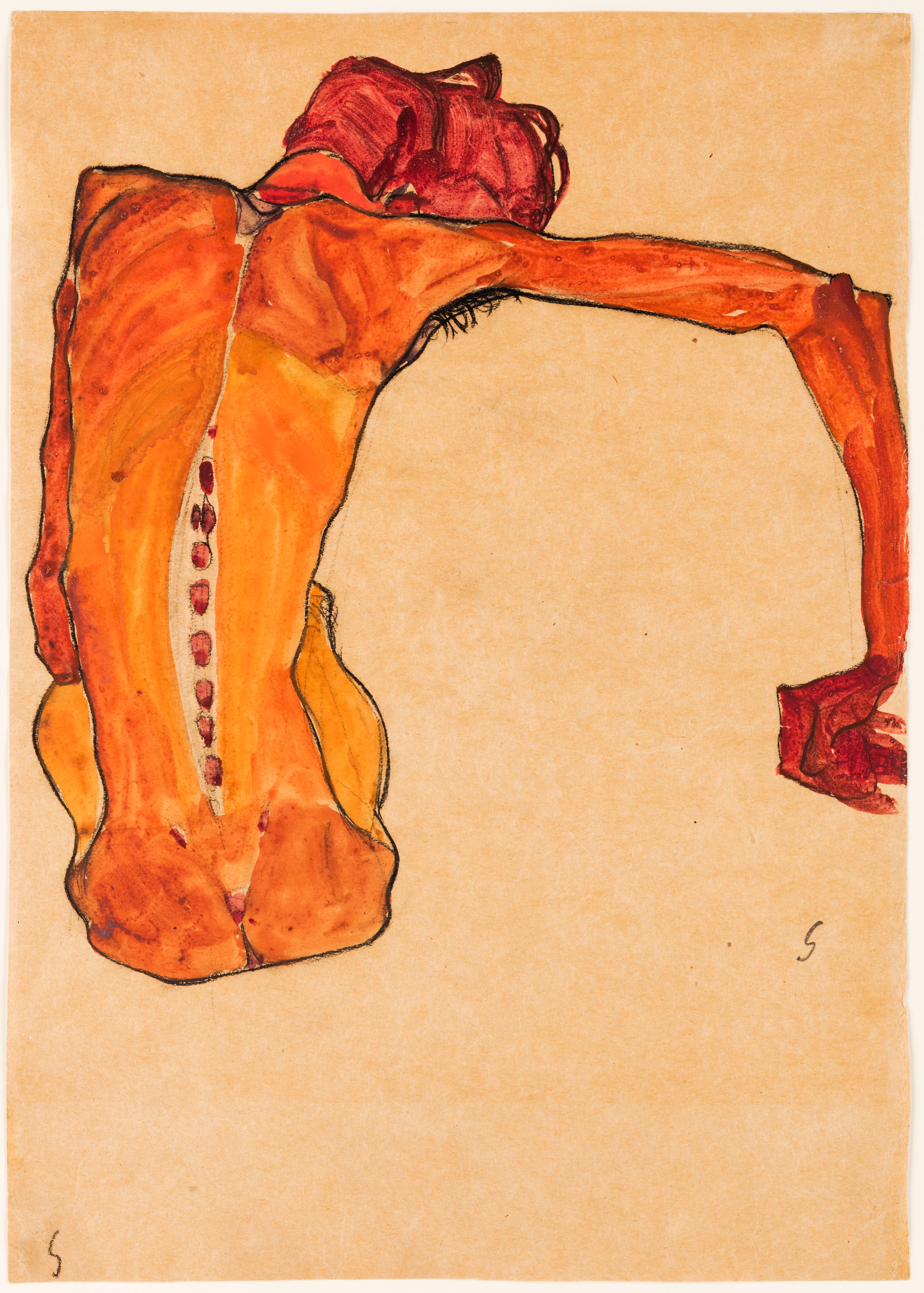 《伸展手臂的坐姿男性裸體》,1910 年, 水彩、水粉和黑色蠟筆紙本, 紐約新畫廊