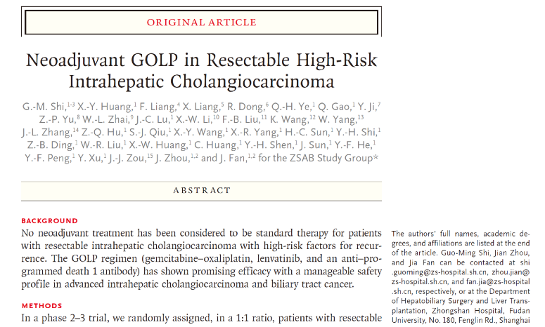 該研究成果題為《新輔助GOLP方案在可切除、伴高危復(fù)發(fā)肝內(nèi)膽管癌研究(Neoadjuvant GOLP in Resectable High-Risk Intrahepatic Cholangiocarcinoma)》,由復(fù)旦大學(xué)附屬中山醫(yī)院肝膽腫瘤與肝移植科樊嘉院士/周儉院士/施國明教授團隊牽頭完成。