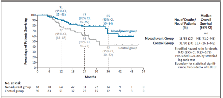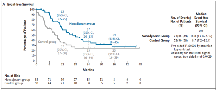 該研究主要終點為無事件發(fā)生生存期(EFS),次要終點包括總體生存時間(OS)、客觀反應(yīng)率(ORR)、R0切除率、主要病理緩解率(MPR)、病理完全緩解(pCR)率、無復(fù)發(fā)生存期(RFS)、和安全性等。