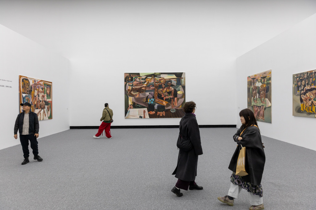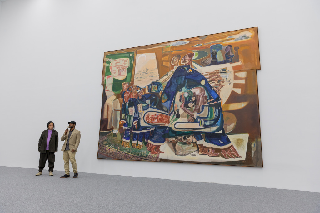 策展人閆士杰、特斯法耶·烏爾蓋薩與作品《沉潛之夢(mèng)》。該作品創(chuàng)作于2025年至2026年初,為布面油畫(huà),400×540 cm(六聯(lián)畫(huà))