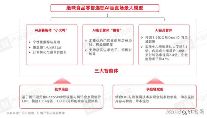 例如,絕味食品依托其龐大的數(shù)據(jù)庫(kù)以及大數(shù)據(jù)分析等算法,構(gòu)建了包含三大智能體的AI智能體矩陣。其中,AI點(diǎn)餐“小火鴨”通過個(gè)性化推薦與互動(dòng),優(yōu)化決策鏈路、增強(qiáng)情緒價(jià)值;絕味的AI店長(zhǎng)“絕知”沉淀14.3 萬條金牌店長(zhǎng)經(jīng)驗(yàn),支持店員邊學(xué)邊干、銷售對(duì)練等;AI會(huì)員智體將圈人、權(quán)益、選品、內(nèi)容等環(huán)節(jié)拆為多Agent協(xié)同,提升活動(dòng)效果。