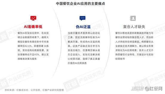 盡管當(dāng)前我國(guó)餐飲AI發(fā)展勢(shì)頭迅猛,但其在落地過程中仍然存在著許多難點(diǎn)。例如,通用模型準(zhǔn)確率偏低、偽AI泛濫成災(zāi)、復(fù)合型人才供需失衡等。