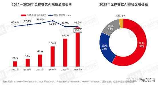 目前,全球餐飲AI市場(chǎng)正處于快速擴(kuò)張期,規(guī)模與增速雙高,展現(xiàn)出強(qiáng)勁發(fā)展動(dòng)能。據(jù)公開信息,2025年全球餐飲AI市場(chǎng)規(guī)模達(dá)到150億美元,同比增長(zhǎng)38.9%,預(yù)計(jì)2026年將突破200億美元。