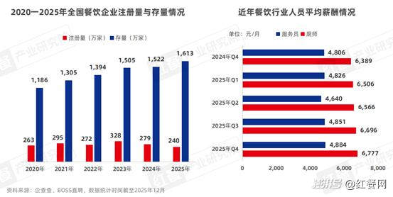 與此同時(shí),人工、食材、租金等核心成本持續(xù)攀升,企業(yè)利潤(rùn)空間不斷被擠壓。以人工成本為例,據(jù)BOSS直聘,2025年第四季度,餐飲行業(yè)廚師與服務(wù)員的平均薪酬分別達(dá)到6,777元/月和4,884元/月,同比增長(zhǎng)6.1%和1.6%。