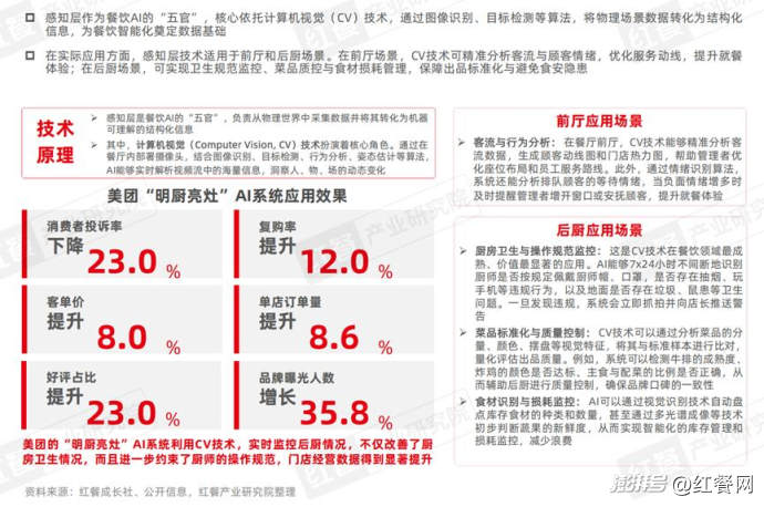 在實(shí)際應(yīng)用方面,感知層技術(shù)適用于前廳和后廚場(chǎng)景。在前廳場(chǎng)景,CV技術(shù)可精準(zhǔn)分析客流與顧客情緒,優(yōu)化服務(wù)動(dòng)線,提升就餐體驗(yàn);在后廚場(chǎng)景,可實(shí)現(xiàn)衛(wèi)生規(guī)范監(jiān)控、菜品質(zhì)控與食材損耗管理,保障出品標(biāo)準(zhǔn)化與避免食安隱患。