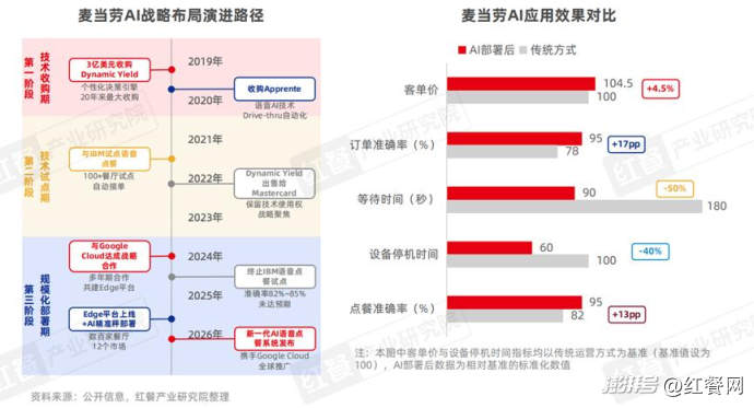 例如,麥當(dāng)勞是最早部署AI智能點(diǎn)餐的餐飲企業(yè)之一。在部署了AI點(diǎn)餐后,其客單價(jià)提升4.5%,訂單與點(diǎn)餐準(zhǔn)確率分別提升17、13個(gè)百分點(diǎn),顧客等待時(shí)間、設(shè)備停機(jī)時(shí)間降幅達(dá)50%、40%,顯著提升了經(jīng)營(yíng)效益與運(yùn)營(yíng)效率。
