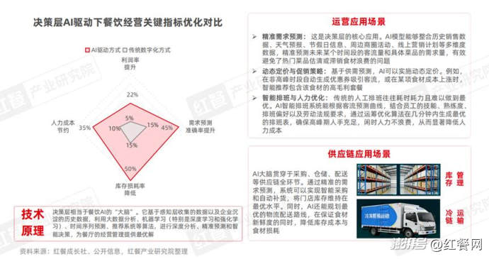 決策層技術(shù)可應(yīng)用于運(yùn)營(yíng)和供應(yīng)鏈場(chǎng)景。在運(yùn)營(yíng)場(chǎng)景,其核心應(yīng)用包括精準(zhǔn)需求預(yù)測(cè)、動(dòng)態(tài)定價(jià)與智能排班,可有效優(yōu)化人力配置、提升運(yùn)營(yíng)效率;在供應(yīng)鏈場(chǎng)景,AI貫穿采購(gòu)、倉(cāng)儲(chǔ)與配送全環(huán)節(jié),實(shí)現(xiàn)智能采購(gòu)與庫(kù)存管理,降低食材損耗。