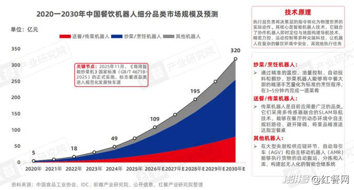數(shù)據(jù)顯示,2020—2030年中國(guó)餐飲機(jī)器人市場(chǎng)規(guī)模預(yù)計(jì)從5億元增長(zhǎng)至320億元,其中炒菜/烹飪機(jī)器人與送餐/傳菜機(jī)器人為核心品類,執(zhí)行層技術(shù)正快速推動(dòng)餐飲作業(yè)自動(dòng)化與標(biāo)準(zhǔn)化,為行業(yè)降本增效提供堅(jiān)實(shí)支撐。