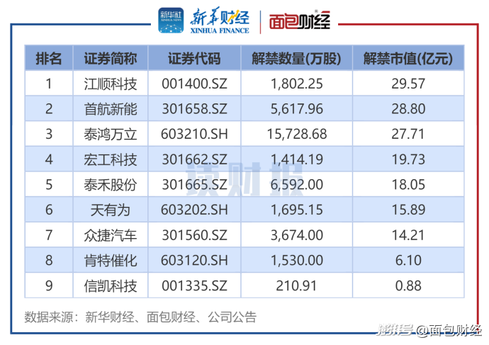 其中,江順科技解禁規(guī)模居首,解禁市值約為29.57億元。首航新能、泰鴻萬(wàn)立的上市周年解禁規(guī)模緊隨其后,分別為28.8億元、27.71億元。