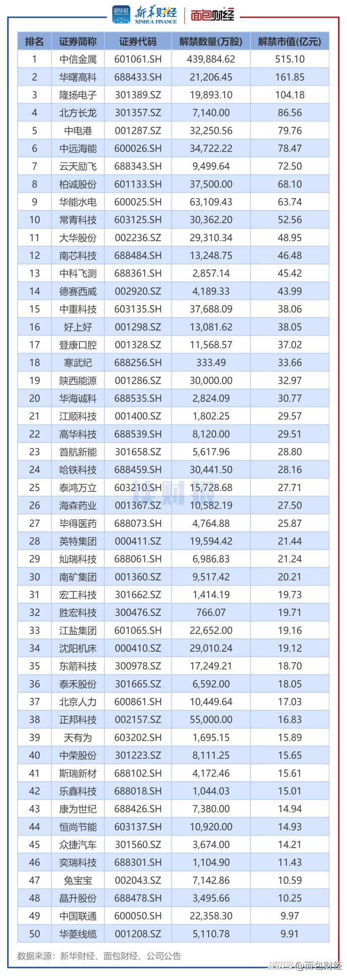 具體來看,中信金屬、華曙高科、隆揚(yáng)電子解禁規(guī)模位列前三。