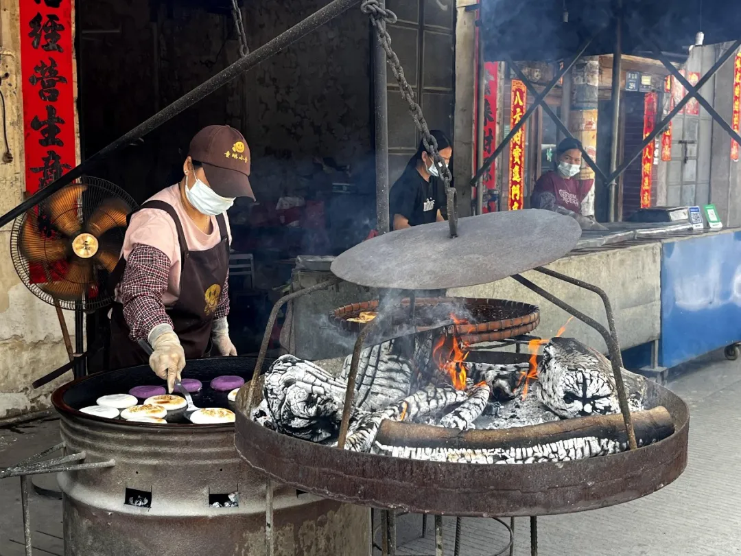馬岡燒餅以明火炭燒、上下雙層慢烤的古法工藝制作,是當(dāng)?shù)卮鷪允氐膫鹘y(tǒng)味道。據(jù)梁女士介紹,這種“上面明火,下面用炭”的做法一直傳承至今,“我們是一代一代傳下來的,從太公的時候就開始做燒餅,我現(xiàn)在已經(jīng)是第四代了。一直以來我們都燒荔枝木,制作燒餅的爐溫有300多度,這樣做出來的餅更香更好吃?!?/p>