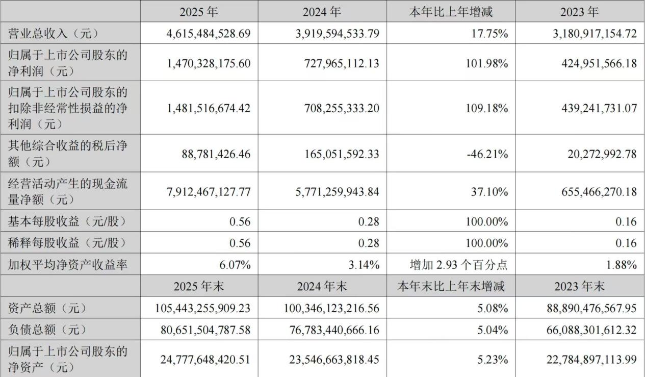 華西證券2025年年報(bào)資料顯示,報(bào)告期內(nèi),公司實(shí)現(xiàn)營(yíng)業(yè)收入46.15億元,同比增長(zhǎng)17.75%;實(shí)現(xiàn)歸屬于上市公司股東的凈利潤(rùn)(下稱“歸母凈利潤(rùn)”)14.7億元,同比增長(zhǎng)101.98%。此外,公司歸屬于上市公司股東的扣除非經(jīng)常性損益的凈利潤(rùn)為14.82億元,同比增長(zhǎng)109.18%。