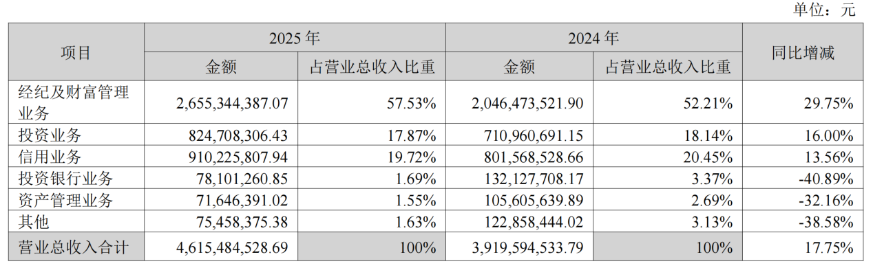 具體而言,2025年,華西證券的經(jīng)紀(jì)及財(cái)富管理業(yè)務(wù)以26.55億元營(yíng)收居首,同比增長(zhǎng)29.75%,為公司第一大收入來(lái)源;投資業(yè)務(wù)營(yíng)收8.25億元,同比增長(zhǎng)16.00%;信用業(yè)務(wù)營(yíng)收9.10億元,同比增長(zhǎng)13.56%。