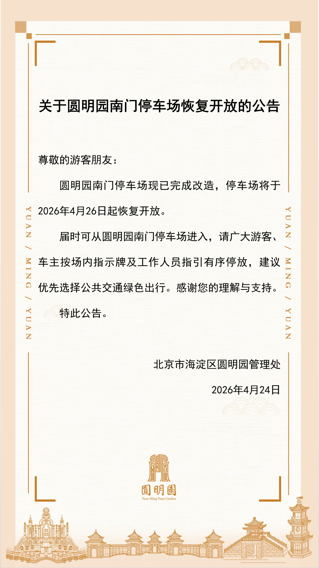 4月24日,圓明園管理處發(fā)布關(guān)于南門停車場(chǎng)恢復(fù)開放的公告?。