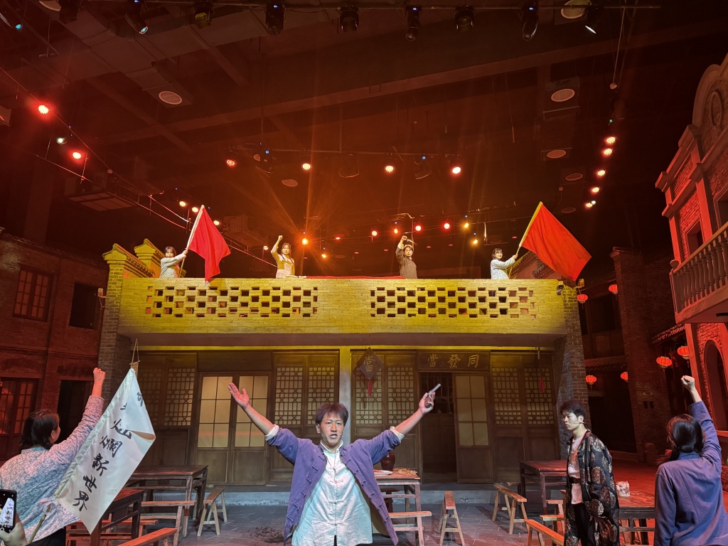 劇場內(nèi),以1929年立夏節(jié)起義為背景的《立夏》實(shí)景劇火熱上演?!拔覀兊膭≈v述的是立夏節(jié)起義期間,革命先輩與民團(tuán)斗爭,最終取得勝利卻也付出巨大犧牲的故事,讓大家了解這段紅色歷史?!憋椦莸叵鹿ぷ髡叩难輪T汪子俊介紹,他本身就是金寨人,出于對(duì)家鄉(xiāng)的熱愛,從外地回到金寨參與實(shí)景演出,至今已有一年多,“后期還計(jì)劃打磨更多劇本,把更多金寨紅色故事搬上舞臺(tái)。”