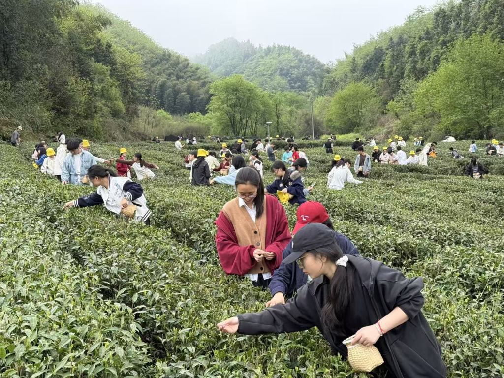 在霍山縣,漫山茶園成了“核心競爭力”。凡沖灣營地內(nèi),百畝茶海不是用來觀賞的背景板,而是可觸摸、可參與、可學(xué)習(xí)的“開放課堂”。4月23日上午,來自合肥八中的研學(xué)隊(duì)伍分散在茶壟間,跟著茶農(nóng)學(xué)采摘。“拇指食指輕捏,只采一芽一葉,像炒菜一樣輕輕翻。”非遺制茶師傅的口訣,讓孩子們?cè)谥讣庥|摸霍山黃芽的百年技藝。