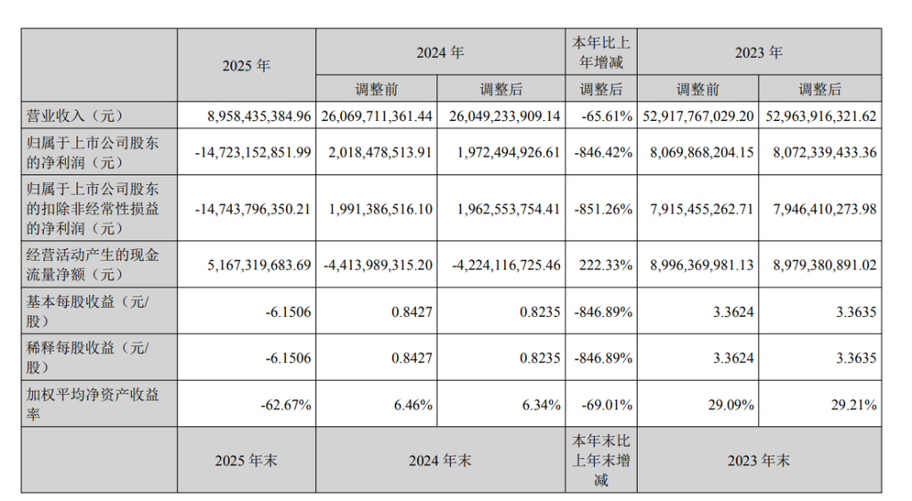 4月27日深夜,智飛生物(300122.SZ)發(fā)布2025年年報,全年營業(yè)收入為89.58億元,同比下降65.61%;歸母凈虧損為147.23億元,扣非凈虧損為147.44億元,這是該公司上市以來首次年度虧損。